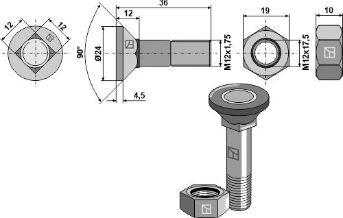 Kyntöruuvi M12x1,75x36 ja kuusikulmainen mutteri